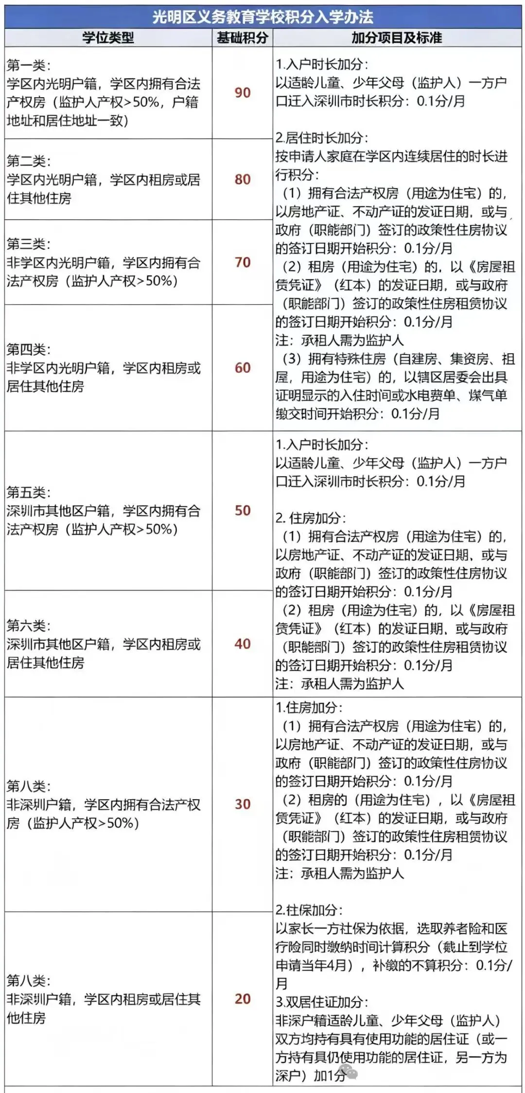 深圳各区积分入学政策虽有差异,但核心逻辑一致:积分 = 基础分 + 加分项,部分区还有特殊加分。录取原则主要分两种:"类别优先,积分排序"(先按户籍和住房类型分类,同类别再比积分)和 "纯积分排序"(不分类别,直接按总积分从高到低录取),罗湖、龙华、坪山、光明等区属于此类模式。
