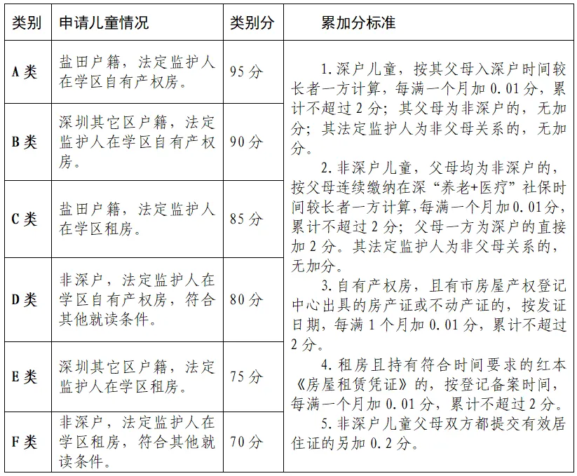 · 6 个档次,A 类(盐田户籍 + 学区房)95 分,F 类(非深户租房)70 分,分差大