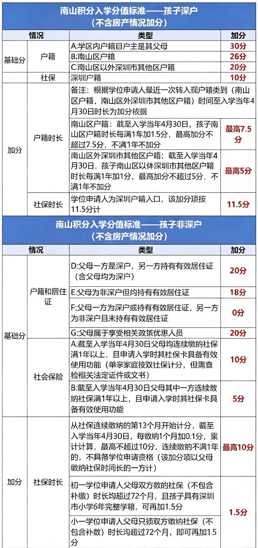 · 加分统一:入户时长、居住时长、社保都是每月 0.1 分,非深户双居住证加 1 分