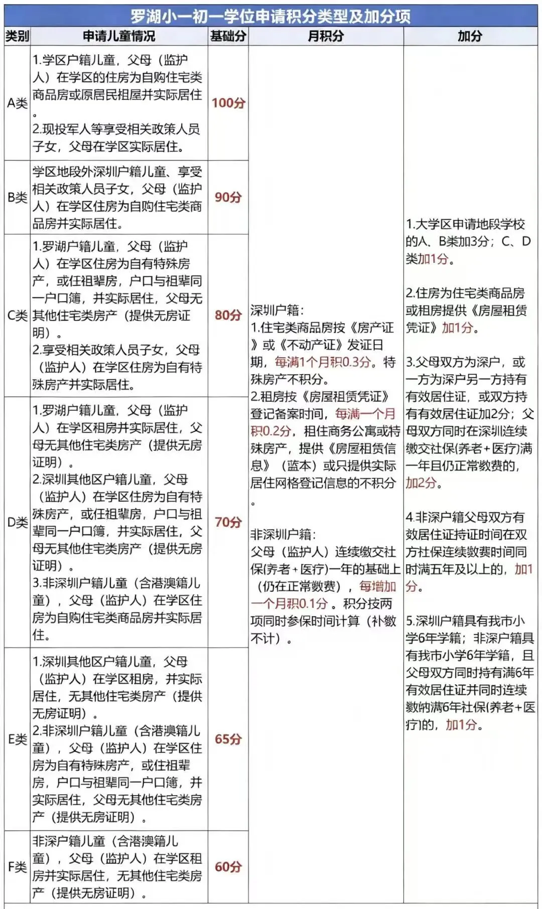 · 一类(龙岗户籍 + 学区房)100 分基础分,六类(非深户租房)60 分,档次分差大