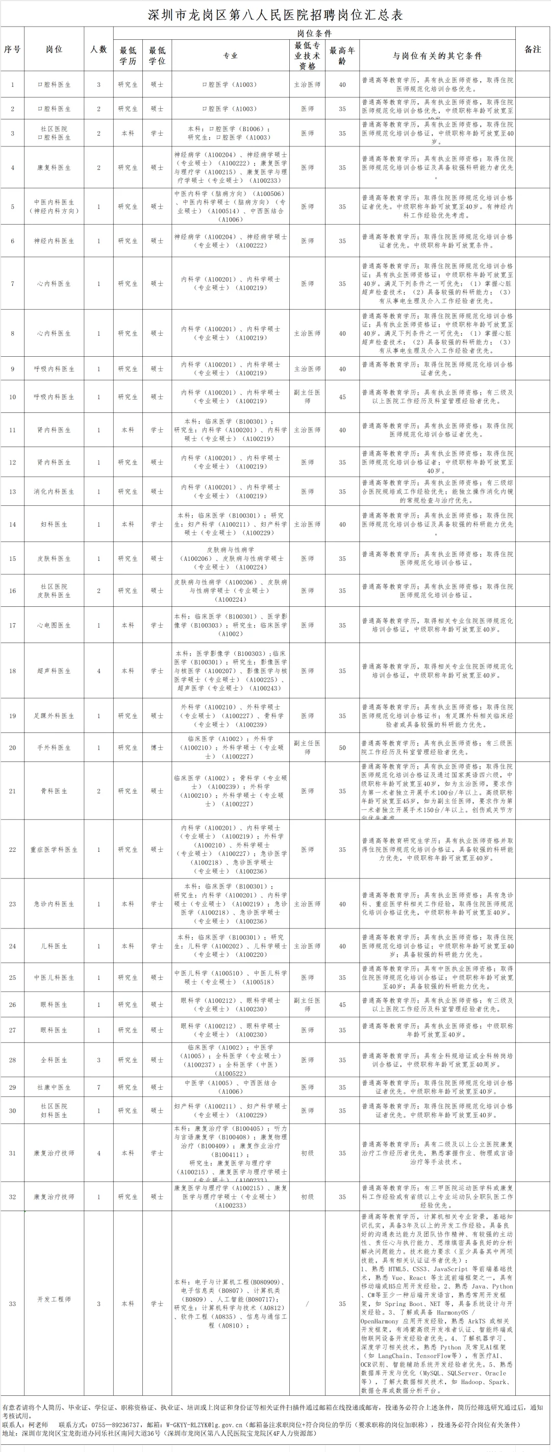 具体招聘岗位、人数和岗位条件详见附件《深圳市龙岗区第八人民医院招聘岗位汇总表》。