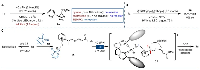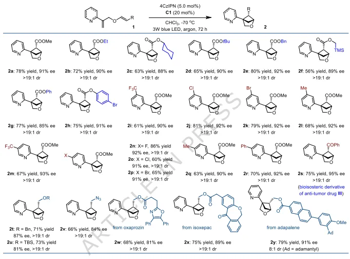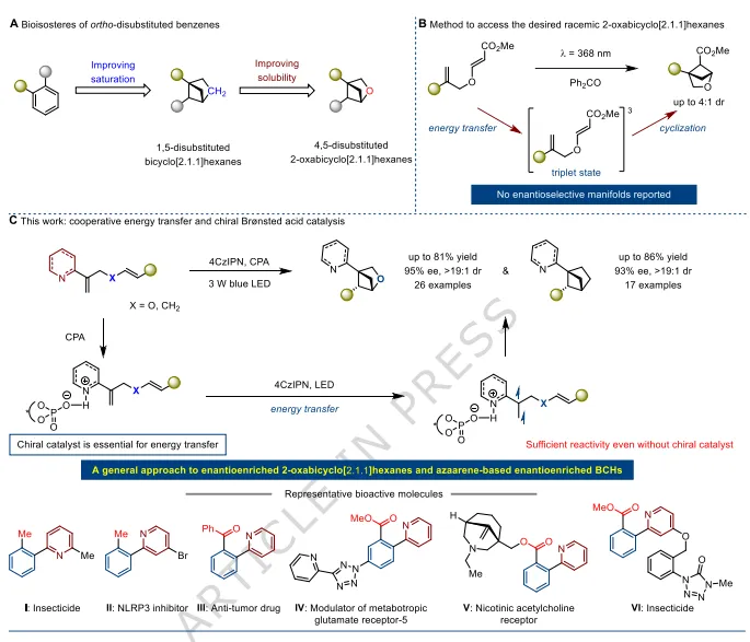 邻二取代苯结构在药物和农药分子中广泛存在,近年来,化学家们对开发含有三维(3D)桥环骨架的其生物电子等排体表现出浓厚兴趣。2026年4月9日,深圳大学张俊民、江智勇在国际知名期刊Nature Communications发表题为《Enantioselective Synthesis of 2-Oxabicyclo[2.1.1]hexanes and Bicyclo[2.1.1]hexanes via Catalytic Asymmetric Intramolecular Photocycloadditions》的研究论文,Dong Tian为论文第一作者,张俊民、江智勇为论文共同通讯作者。因此,4, 5-二取代-2-氧杂双环[2.1.1]己烷因其增强的药理活性、改善的代谢稳定性,以及尤为重要的优异水溶性,成为极具潜力的候选骨架。作者报道了通过光诱导能量转移(EnT)与手性布朗斯特酸协同催化的分子内[2+2]光环加成反应,实现该类化合物的对映选择性合成。以高产率、良好至优异的对映选择性和非对映选择性合成了一系列具有重要价值的吡啶官能化2-氧杂双环[2.1.1]己烷衍生物。此外,该无过渡金属策略为构建吡啶基双环[2.1.1]己烷提供了高效且模块化的途径,此类化合物含有极具挑战性的结构单元——吡啶环直接连在桥头碳原子上。机理研究表明,光敏剂与低温反应对手性催化剂不可或缺地促进底物激发至三重态、进而在高活性转化中实现立体选择性控制起到关键作用。在药物科学中,生物电子等排体设计已成为加速发现新药候选物的核心策略,能够使候选药物相比母体化合物具有更优的药理性质。在这些策略中,三维桥环骨架已成为苯环的有效生物电子等排体,而苯环是生物活性分子中最普遍的结构单元之一。特别是,鉴于邻二取代苯单元在300余种已上市药物和农药中的广泛存在,寻找其合适的生物电子等排体成为研究热点。因此,1, 5-二取代双环[2.1.1]己烷(BCHs)被认为是极具前景的替代骨架。研究表明,将BCH骨架替代苯环能够增强关键分子性质,包括药理活性和代谢稳定性。然而,其水溶性与母体邻二取代苯相近,限制了该生物电子等排策略在药物设计中的更广泛应用。2023年,Mykhailiuk及其团队解决了这一局限,提出4,5-二取代-2-氧杂双环[2.1.1]己烷作为更优的生物电子等排体,不仅保留理想的药理学特征,还表现出显著提升的水溶性。这类骨架可通过光诱导能量转移(EnT)催化过程从简单二烯化合物便捷制备。尽管如此,该方法的立体选择性中等(非对映选择性dr≤4:1)。更关键的是,尽管该类化合物拥有三个立体中心(平面邻二取代苯不具备的特征),但尚未实现从易修饰底物出发的对映选择性合成,而对映纯在手性药物开发中至关重要。这一难点可能源于三重态中间体的高反应性,阻碍了手性催化剂对其进行有效的对映面区分,同时也存在竞争性的外消旋背景反应。值得注意的是,Bach及其团队提出了一种光激发策略以克服后一挑战,即底物2-(烯氧基)环己-2-烯酮的两个氧原子与手性铑催化剂原位形成的复合物,而非底物本身,在可见光下直接激发。此外,Zi及其团队报道了手性钯催化双环[1.1.0]丁烷(BCBs)与醛的分子间[2+2]环加成反应。然而,这些产物不具备邻二取代苯生物电子等排所需的结构特征,正如Mykhailiuk团队在比较不同取代模式的2-氧杂双环[2.1.1]己烷与对应邻二取代苯分子的生物活性时所证实的。因此,发展高效实用的对映选择性方法合成这类特定生物电子等排体仍是亟待解决的重要挑战。毋庸置疑,简单二烯的分子内环加成反应凭借底物易得性以及优于分子间反应的化学与区域选择性,为合成具有多样4-位和5-位取代基的高值手性富集2-氧杂双环[2.1.1]己烷提供了极具前景的途径。近年来,该策略已成功用于构建其他苯环生物电子等排体。例如,Rigotti、Tortosa及其团队开发了一种光驱动不对称分子内[2+2]环加成反应,使用Λ-RhS作为手性路易斯酸催化剂,合成手性富集的5-酰胺官能化双环[2.1.1]己烷。该方法依赖Λ-RhS与二烯的酰胺部分相互作用形成光敏物种,在光照下产生三重态。为获得手性富集的2-氮杂双环[2.1.1]己烷(aza-BCHs),本团队发展了DPZ作为光敏剂、手性钪(III)配合物催化的不对称分子内[2+2]光环加成双催化体系。在此体系中,由于给电子胺取代基导致三重态烯烃反应性低,外消旋背景反应被抑制。手性钪(III)配合物作为路易斯酸提供足够的活化能以实现高效环化。这些发现表明,二烯底物中不同类型的烯烃可能需要不同的催化策略,这构成了重大挑战。基于本团队在芳环生物电子等排体不对称光催化方法上的研究基础,本文报道了通过不对称分子内[2+2]光环加成反应合成手性富集4,5-二取代-2-氧杂双环[2.1.1]己烷的解决方案。采用无过渡金属双催化体系——手性布朗斯特酸与光敏剂协同能量转移(EnT)光催化,以高产率、良好至优异的对映选择性和非对映选择性合成一系列具有多样桥头吡啶取代基的产物。这类骨架作为临床和农用相关化合物的生物电子等排体,具有重要药学价值。关键的是,立体选择性控制依赖于光敏剂与手性布朗斯特酸的精准匹配。作为光敏剂的4CzIPN具有与底物烯烃相近的三重态能级,在低温下不经活化则无法反应。手性磷酸(CPA)通过轻微降低烯烃的三重态能级活化烯烃,使能量转移过程得以进行。这种协同作用在三个立体中心形成过程中实现高效对映面区分,同时抑制外消旋背景反应。重要的是,该方法的高效性与通用性实现了桥头含吡啶取代基的手性富集双环[2.1.1]己烷(BCHs)的精准合成。图1:研究背景与工作概述。(A)邻二取代