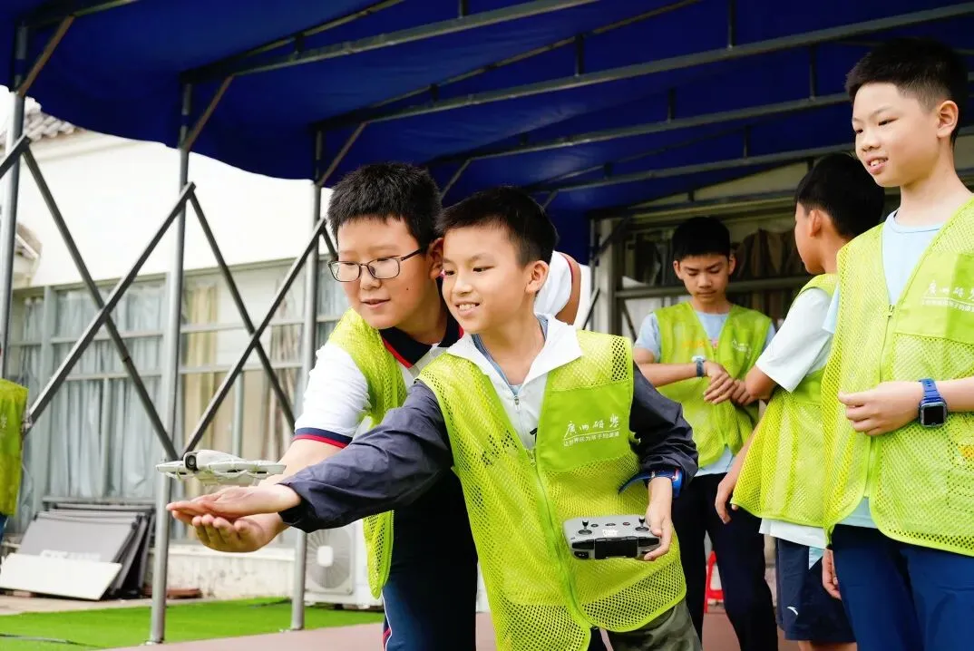 讲解结束后,在导师的悉心指导下,孩子们双手轻握DJI Neo掌上无人机,目光专注、小手轻轻一挥,机身便从掌心轻盈起飞!