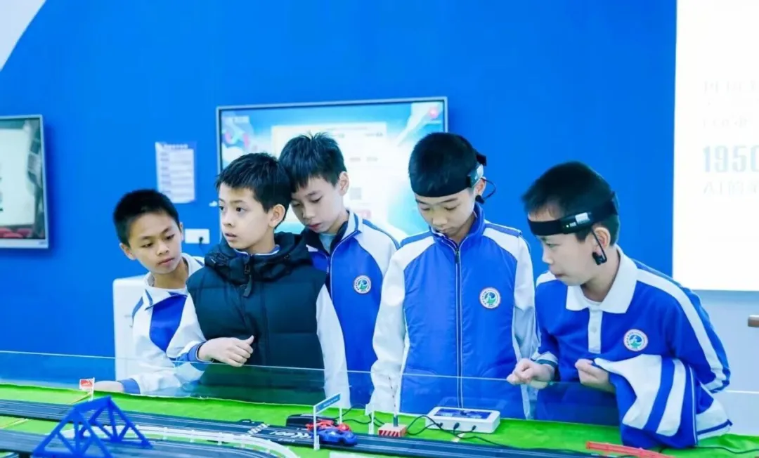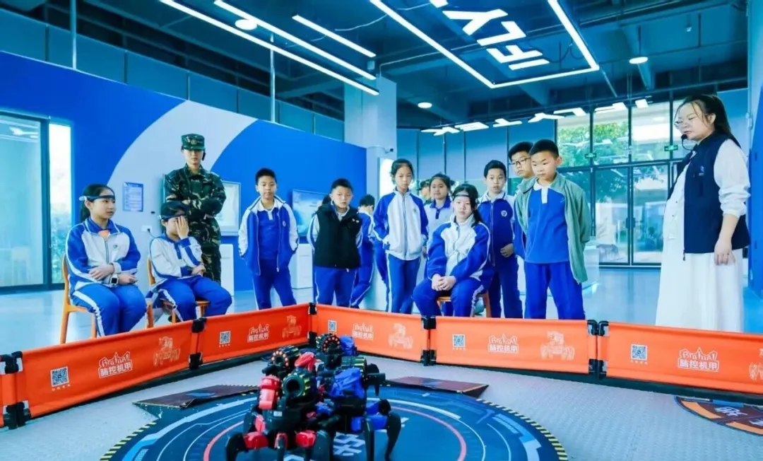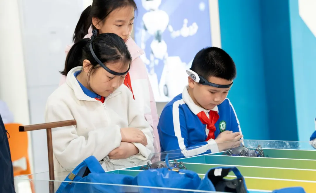 在脑控智能体验区,同学们佩戴脑波头环,实时监测大脑专注度,学习如何通过意念控制设备,切身感受脑电活动与行为控制的奇妙关联。