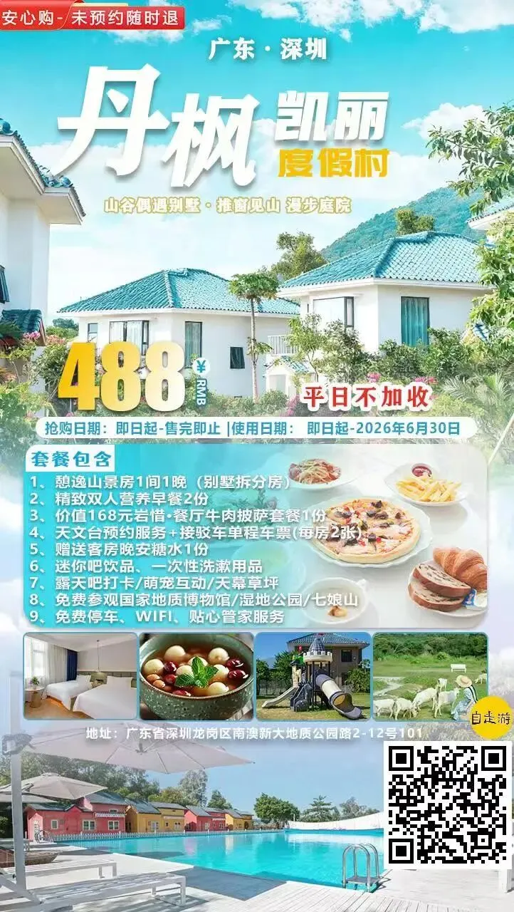 预订温馨提示:关注公众号回复【深圳丹枫凯丽度假村】,或长按识别文中产品【海报二维码】即可购买,或点击本文左下角“阅读原文”即可进入查看产品详细信息和购买。