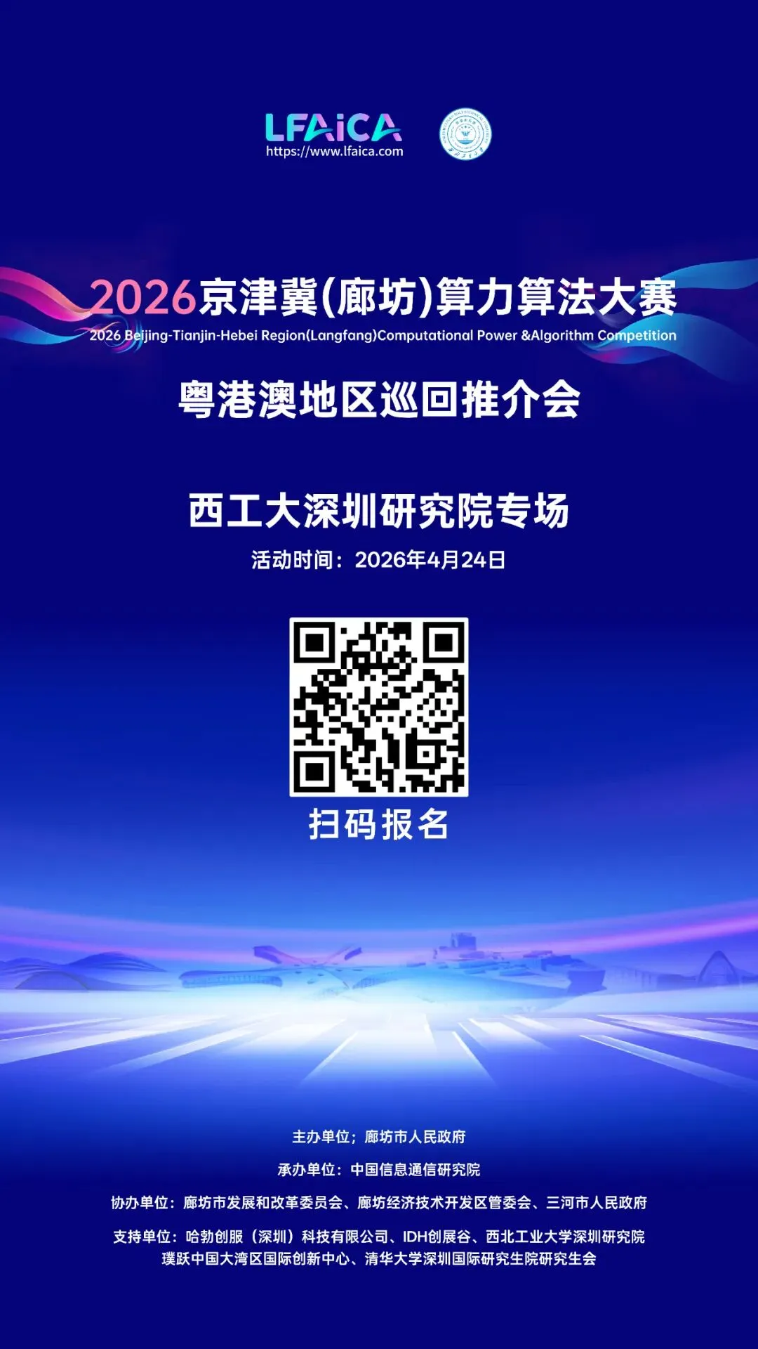 为扩大本次赛事影响力,吸引广大算力算法领域的创业项目报名参与本次大赛,大赛主办方将于 4 月 24 日在深圳联合西北工业大学深圳研究院等大湾区科创生态伙伴举办2026京津冀(廊坊)算力算法大赛粤港澳地区巡回推介会-西北工业大学深圳研究院专场,诚邀算力算法领域的创业企业、准创业者,投资机构,企业服务机构等生态伙伴报名参加。