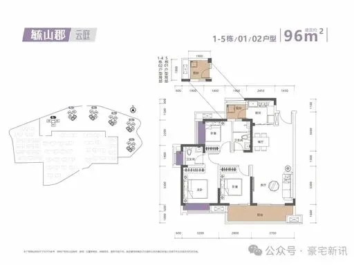 约 96㎡ 3 房 2 厅 2 卫经典实用三房,动静分区,客餐厅直通观景阳台,主卧套房设计,性价比首选。