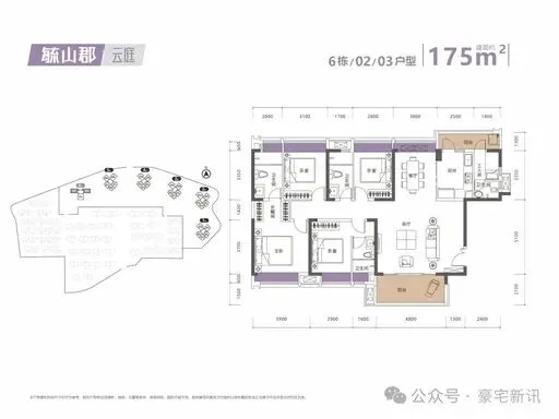 约 175㎡ 4+1 房 2 厅 3 卫奢阔大平层,独立入户玄关,双套间主卧,多阳台设计,270° 环幕观景,墅级享受。