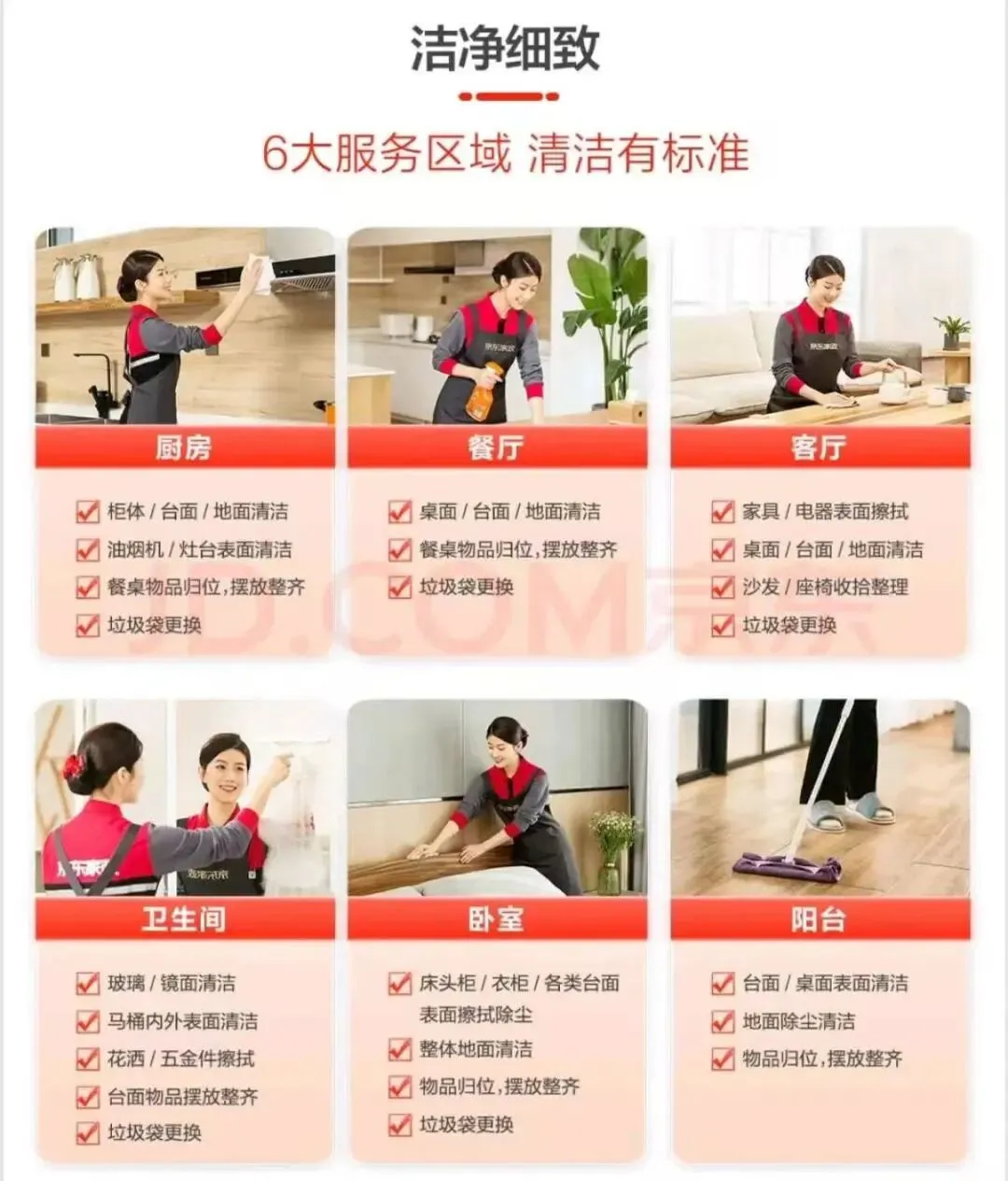 服务要求:严格遵循京东标准化保洁流程,保证清洁质量,维护服务礼仪,妥善回应客户合理需求;