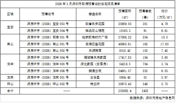 2026年3月深圳市一手房新增2452套,环比上涨333%,同比下降28%;新增面积25.39万㎡,环比上涨318%,同比下降15%。