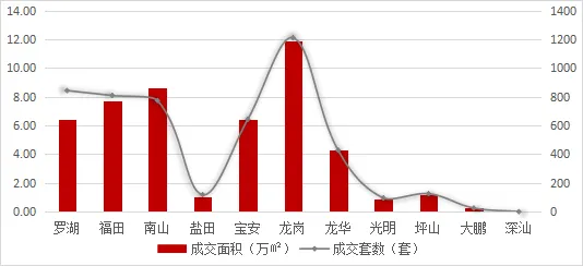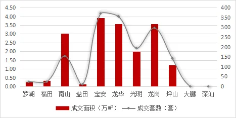 从区域上看,3月宝安区、龙华区和龙岗区为主力成交区域。其中宝安区成交370套,占全市成交量的23.55%,主要成交楼盘为保利瑧誉府、鸿荣源珈誉玖玺、会展湾雍境花园、珺悦名都等;龙华区成交355套,占全市成交量的22.60%,主要成交楼盘为鹏宸云筑、珑门壹品、鸿荣源观城、幸福城臻园等;龙岗区成交297套,占全市成交量的18.91%,主要成交楼盘为乐宸花园等。大鹏新区及深汕合作区均无成交。