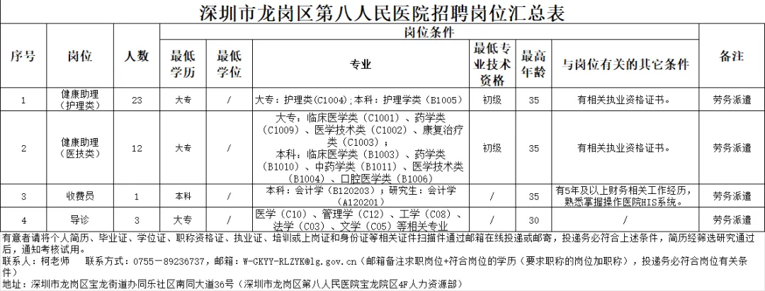 具体招聘岗位、人数和岗位条件详见附件《深圳市龙岗区第八人民医院招聘岗位汇总表》