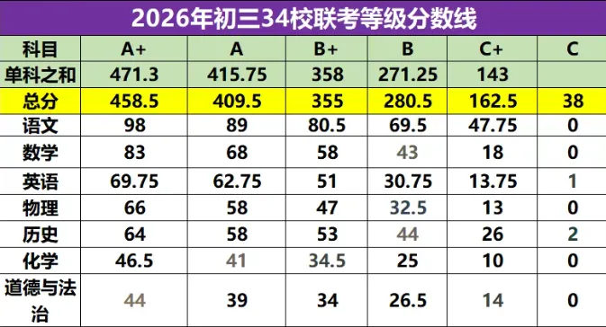 注意:联考各科等级线差异较大,比如英语A+线69.75分,难度相对较低,孩子若英语分数偏低,属于“可控弱科”,短期可补。