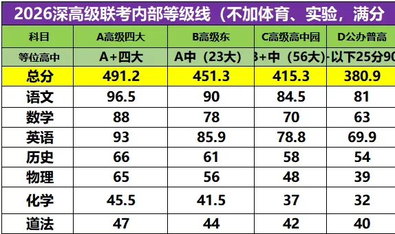 公办普高线(D公办普高):总分380.9分,这是深圳初三家长的“底线目标”,各科需均衡达标(比如语文81分、数学63分),低于这个分数,公办普高风险极高;