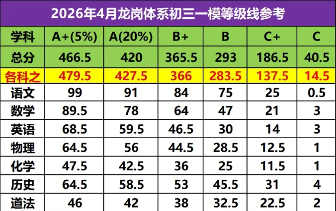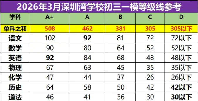 补充:龙岗区一模新增“各科之和”等级线,家长可同时对照“总分”和“各科之和”,更精准判断孩子的薄弱环节(比如各科之和达标,但总分偏低,可能是答题规范问题)。