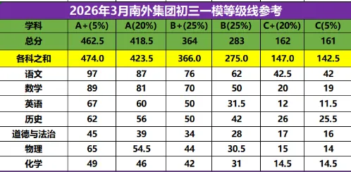 【适用人群】南外集团(含南外高新、南外滨海)学生,想冲刺南山优质公办高中的家长(南外集团理科优势明显,等级线贴合集团内生源水平)。