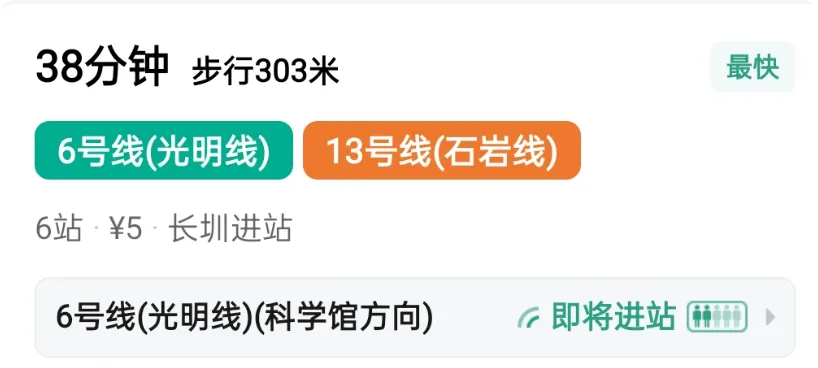 从光明长圳站坐普通地铁到南山西丽,要 7 站、耗时38分钟;从龙岗大运北站搭乘深惠城际到西丽,仅 5 站,只需25分钟。