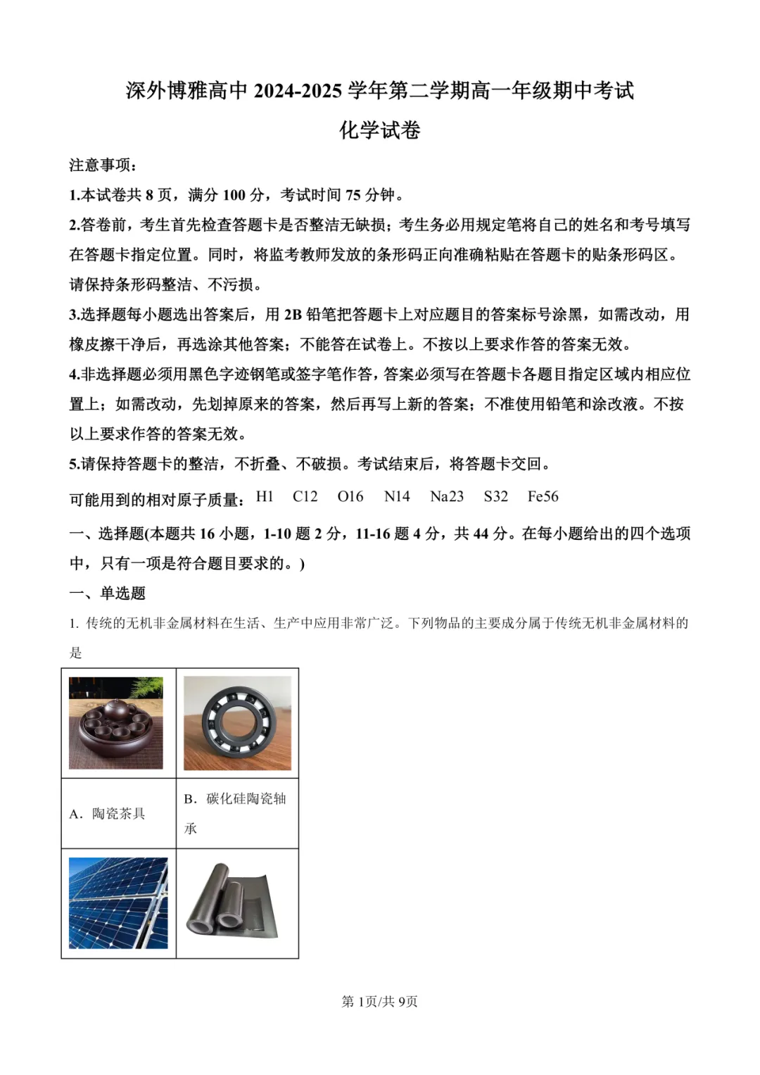 2024-2025学年深圳市高一下学期4月期中考试化学试题