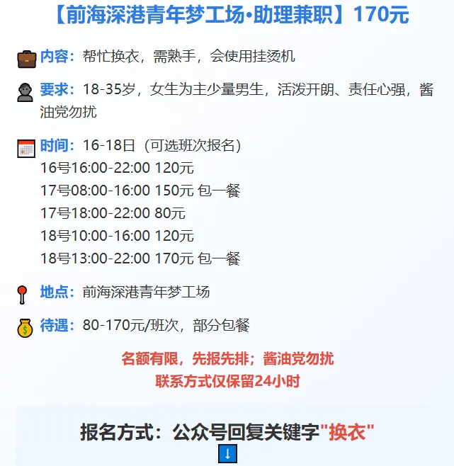 >【深圳兼职】深港青年梦工场·助理兼职丨薪资170元,帮忙换衣,需熟手,会使用挂烫机,女生为主少量男生.