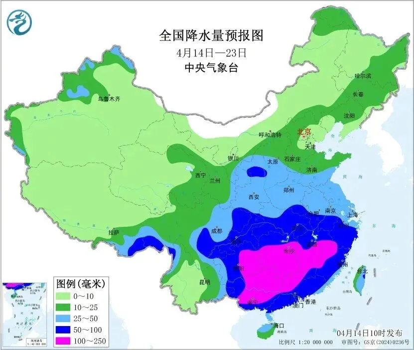 未来10天(4月14至23日),主要降雨区位于江南、华南以及西南地区东部等地,累计降水量有50至100毫米,其中江南南部、华南北部及贵州东部的部分地区有110至150毫米;西北地区东部、黄淮、江汉、江淮以及四川、西藏东南部等地累计降水量有20至40毫米,局地50毫米以上;