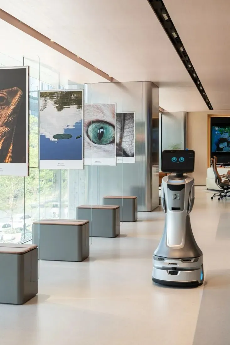 On the second floor, a more immersive and multidimensional experience unfolds. A robotic coffee bar, set against a backdrop of flowing water imagery, introduces a dynamic interplay between technology and nature. The YOYO AI Agent zone brings artificial intelligence to life through intuitive, lifelike interactions. Everyday scenarios of home, work, entertainment, and creation are interwoven across the space, composing a continuous narrative of daily life. At the far end, the space shifts into a more intimate setting—a home-like lounge with expansive views. Soft lighting, warm wood textures, and an enveloping layout evoke the intimacy and comfort of a living room, offering a place to pause, gather, and connect.