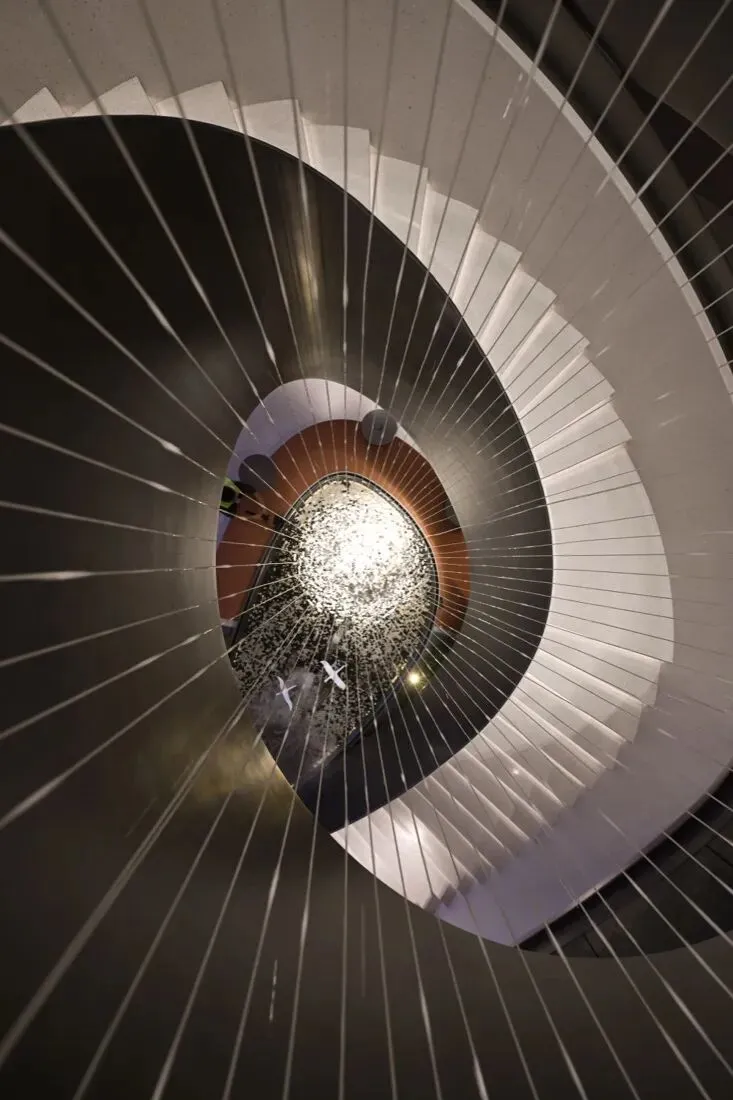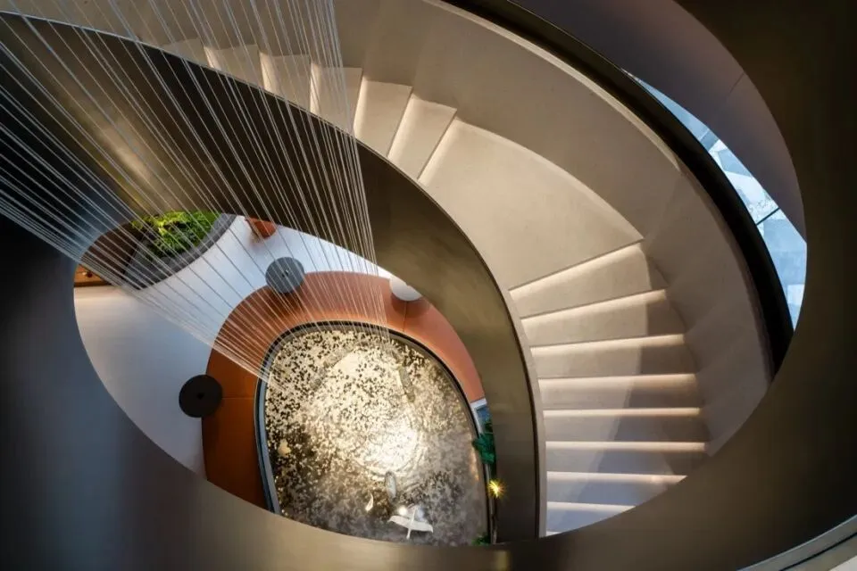A sculptural spiral staircase wraps around a cascading water installation, transforming the vertical journey into an encounter with water’s momentum and resilience. At its base, a miniature landscape offers an artistic reinterpretation of Shenzhen Bay’s mangrove ecosystem.