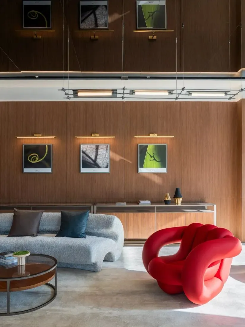 首层空间的核心是这块约 45㎡ 的沉浸式大屏,结合流水意象与阿尔法品牌LOGO,在昭示品牌形象的同时,扩展了空间的延伸感,以灵动动态的自然元素呼应设计的初衷。
