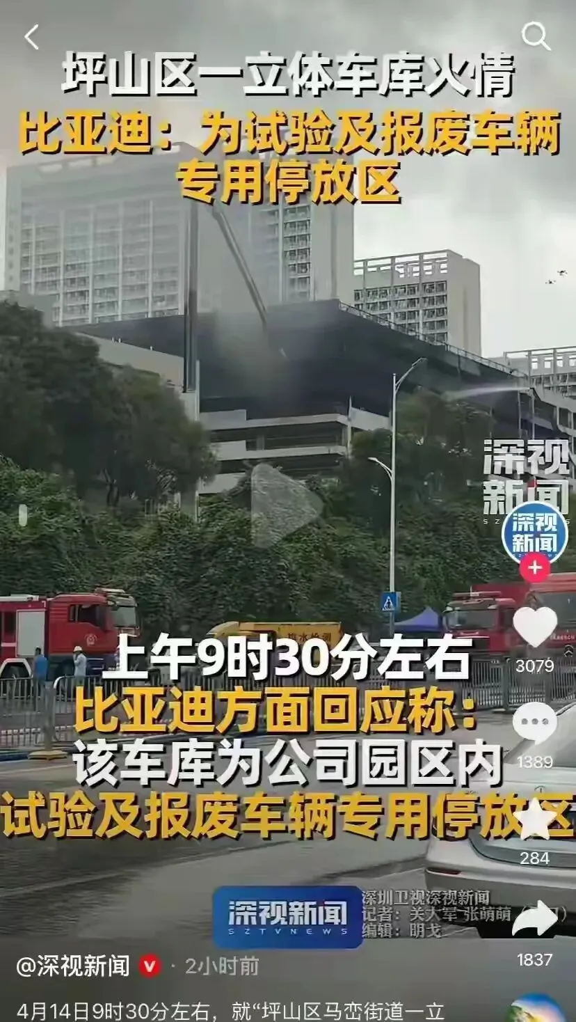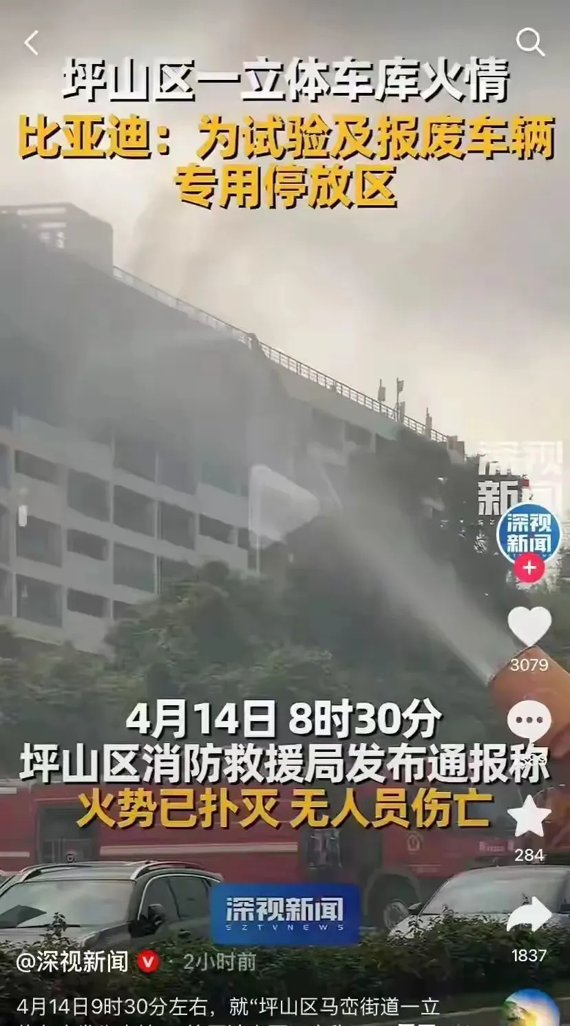 据官方发布信息,2026年4月14日凌晨,比亚迪深圳坪山园区一立体车库发生火情,该车库为试验及报废车辆专用停放区。火情发生后,市区两级应急、消防等救援部门第一时间赶赴现场,迅速开展灭火处置工作,经过专业救援,现场火势很快被成功扑灭。