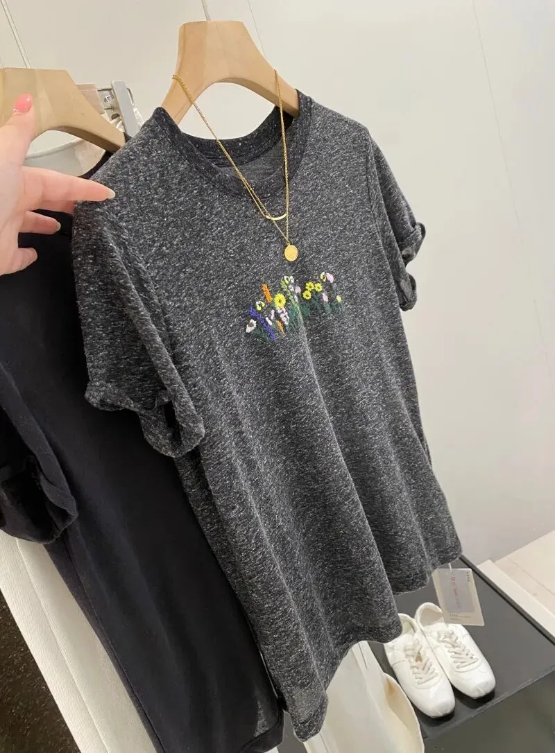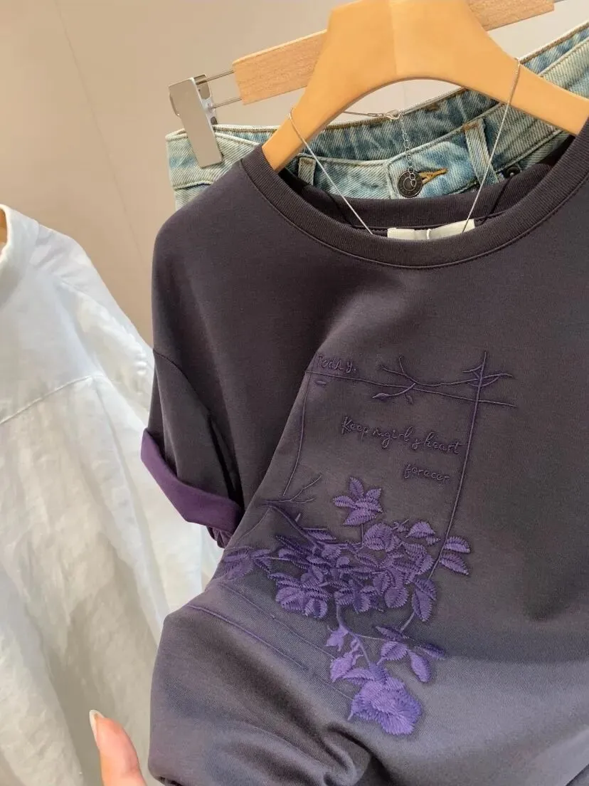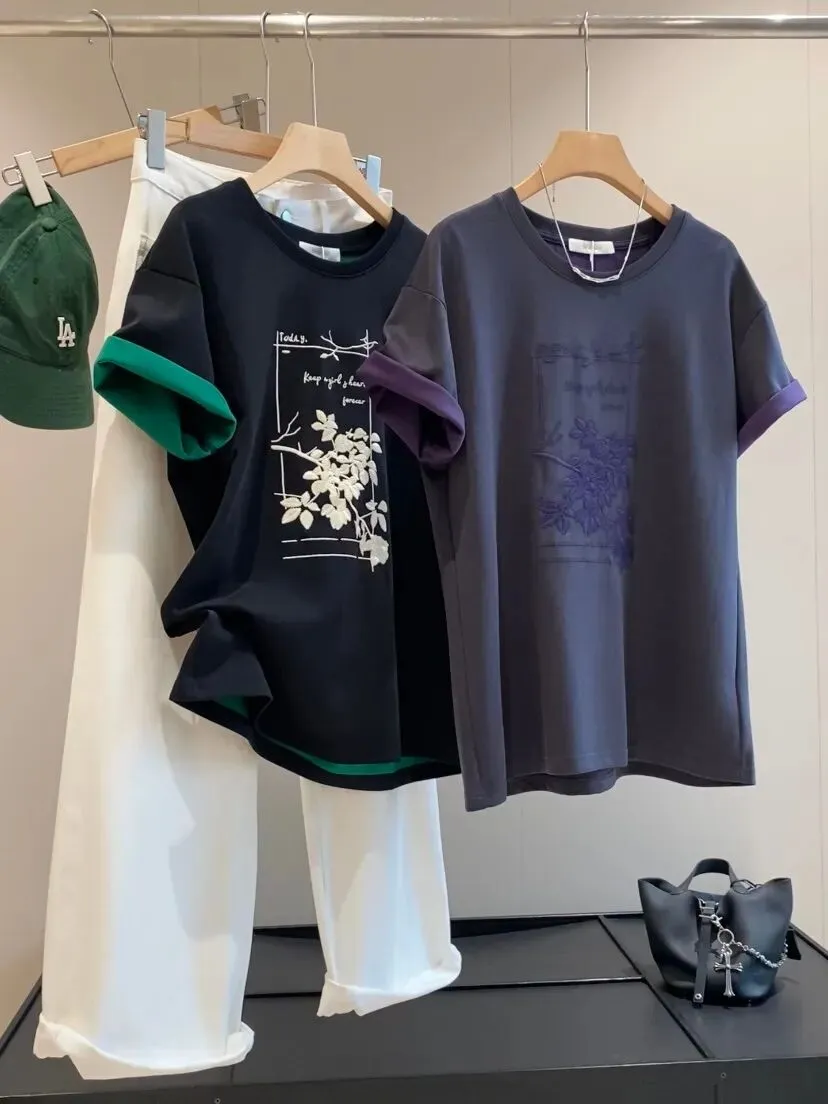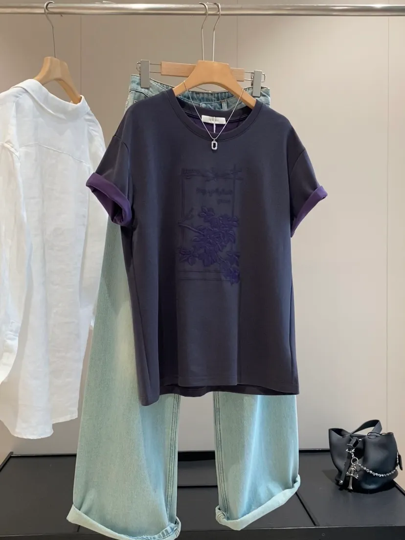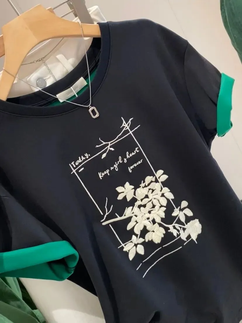 【淘宝】https://e.tb.cn/h.ipsp7PhxnWE12gr?tk=rmcU5gqH88r CZ057 「IN BLUE Chency家!春夏百搭高克重双色面料立体玫瑰刺绣短袖T恤」