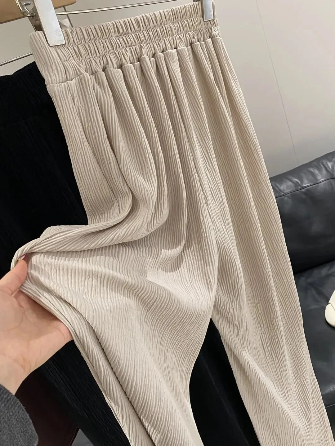 做的是宽松休闲裤样式,自带竖条纹肌理感