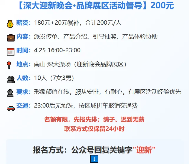 【深圳兼职】深圳大学·迎新晚会兼职丨薪资200元,共需要10人(7女3男),产品体验协助、引导抽奖、派发传单、产品介绍.