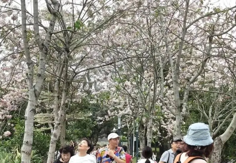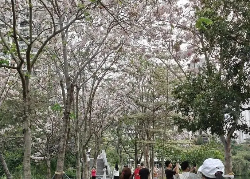 莲花山的风铃木,粉红的花瓣轻描胭脂,小喇叭随风弹奏,东湖公园紫色的禾雀花和凤凰花相映成趣,让人流连。