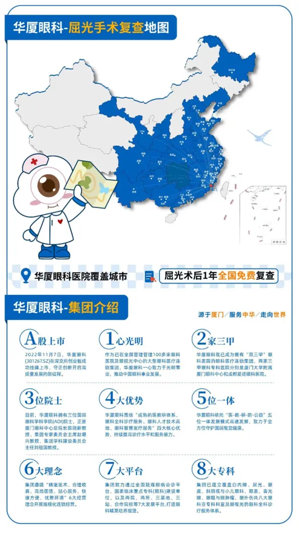 华厦眼科医院集团是国内大型眼科医疗连锁机构、深交所创业板上市企业(股票代码:301267),全国管理100多家眼科医院和眼视光诊所,服务网络覆盖广泛。在华厦眼科手术,可享受术后1年全国华厦眼科集团旗下医院免费复查服务——无论你去到哪里,专业的关怀始终相伴。