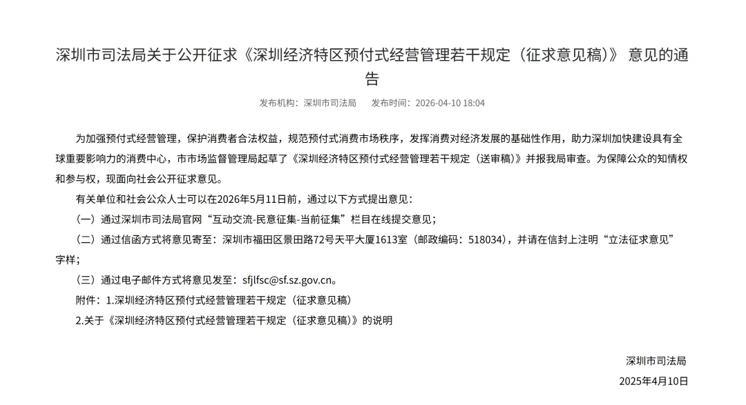 目前,《规定》正通过深圳市司法局官网等渠道公开征求意见,公众可在2026年5月11日前,通过深圳市司法局官网“互动交流-民意征集-当前征集”栏目在线提交意见,或通过电子邮件方式将意见发至:sfjlfsc@sf.sz.gov.cn。