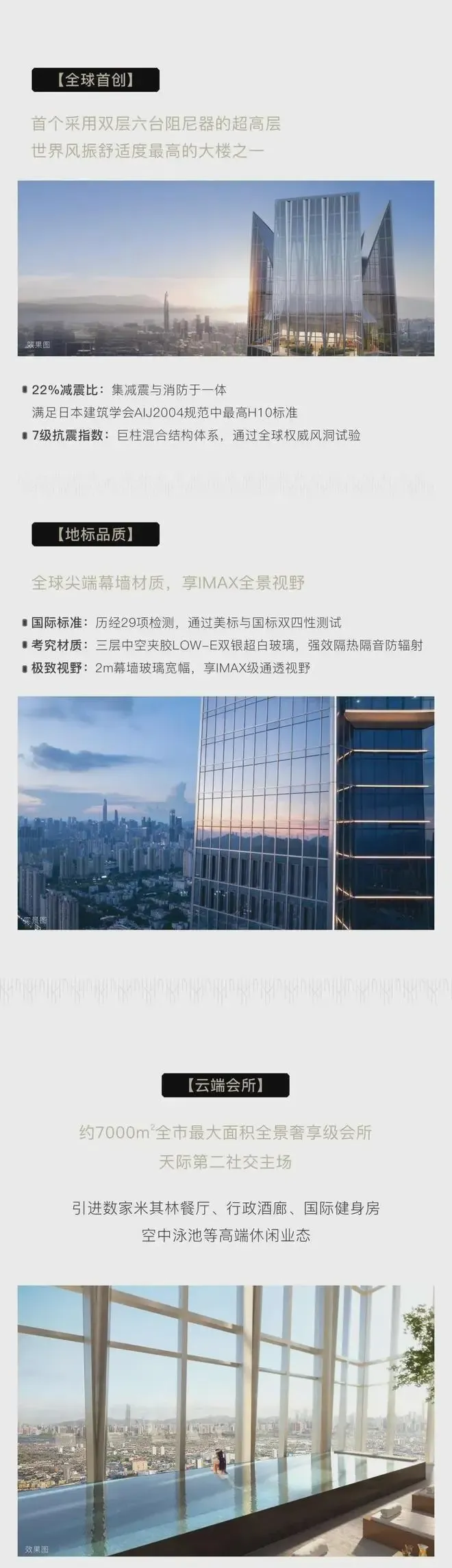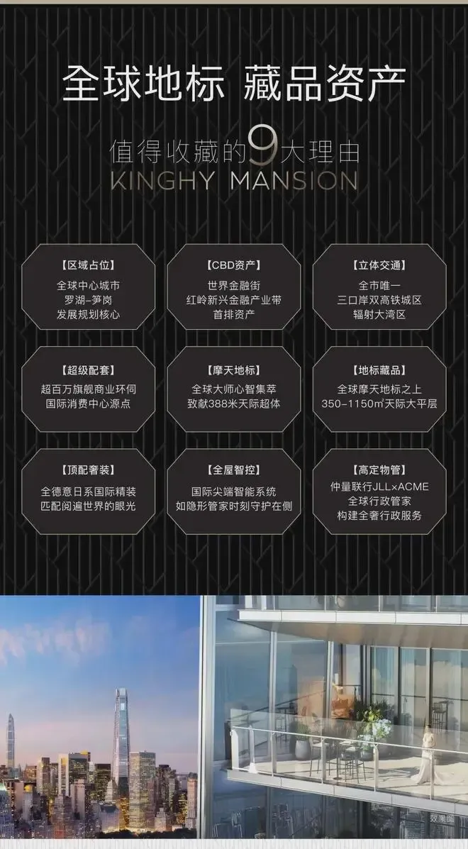 深圳城脉中心璟喜(别名:城脉金融中心)是位于深圳罗湖福田双中心之上的高端豪宅项目,坐拥388米天际地标高度。项目提供约350~1150㎡艺术品级行政公馆,兼具居住、商务接待、私人会所多重功能。室内设计由新加坡SCDA和香港CCD担纲,配备全球顶奢品牌与全时专属服务,是塔尖圈层的理想汇聚之地。城脉中心璟喜从隽永建筑到奢阔空间,从云端风光到典雅家居,从质感非凡的公区功能空间到高度定制化的服务,再到栖居其中的整座理想之城,汇集尖端设计与资源构筑而成的,兼具绝无仅有的精神视角与建筑高度,将整个城市CBD的生命与活力尽收眼底。在兼得过去与未来的城市景象中,收藏属于深圳、属于中国的澎湃盛景。