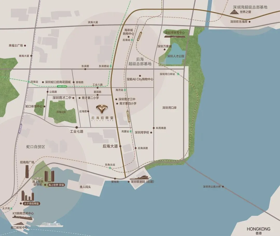后海招商玺位于南山区招商街道后海大道以西、工业七路以北,地处深圳湾超级总部基地辐射范围,周边3公里内覆盖深圳湾体育中心、深圳湾公园、太子湾邮轮母港等城市地标,形成了“高端居住+滨海休闲+国际商务”的复合生态圈。