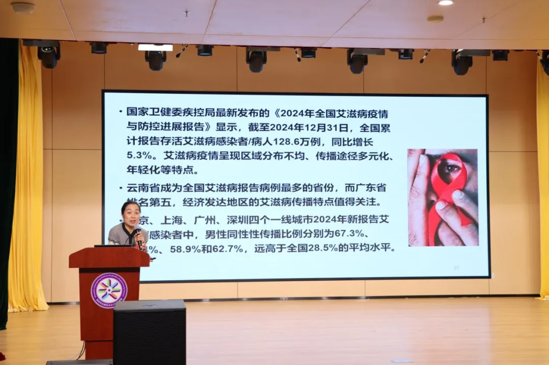 在艾滋病防治部分,张教授用通俗的语言、真实的案例与最新数据,系统讲解传播途径、防护措施与认知误区,强调艾滋病“可防可控不可治愈”,并指出青年学生疫情形势严峻,提醒学生远离高危行为、做好科学防护。