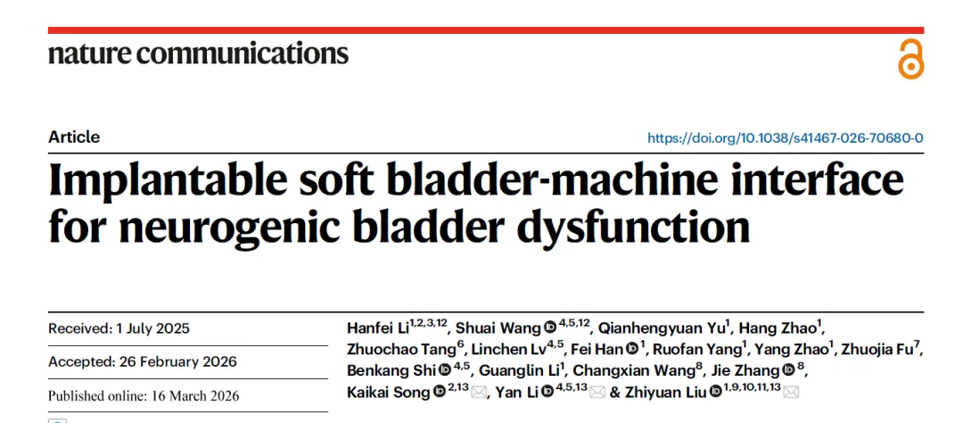 当然,本研究也保留了进一步拓展的空间。当前器件已经能够有效诱发膀胱压上升并降低非排尿性收缩频率,但尚未实现真正意义上的协调排尿。文中据此指出,未来需要考虑将膀胱刺激与外尿道括约肌松弛协同起来,并探索更优的刺激参数和多电极阵列设计,以实现更大范围、更具时空协调性的逼尿肌招募。此外,虽然现阶段仍借助了传统膀胱压力监测进行验证,但研究已明确提出,希望最终以变形传感替代压力监测,实现更简化、患者友好的诊断与干预体系。总体而言,本研究证明了一种软性膀胱-机器界面不仅可以在大幅各向同性变形环境中长期稳定工作,还能够对神经源性膀胱的异常活动进行实时识别与局部电刺激调控。其真正的创新价值,在于把柔性材料学、可植入生物电子学和神经泌尿调控有机结合起来,为慢性膀胱疾病的个体化闭环治疗提供了扎实的实验依据和清晰的技术方向。