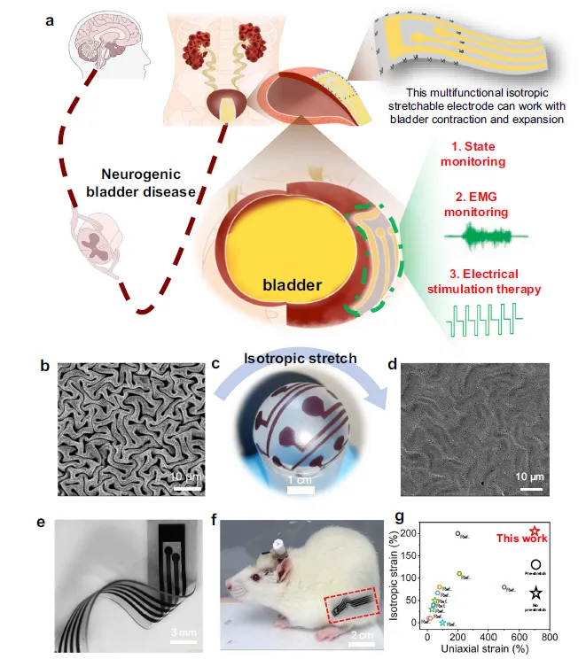 本研究首先从器件构型出发,提出了一种面向神经源性膀胱治疗的软性植入式膀胱-机器界面。该系统并非单一传感器,而是将膀胱形变监测、逼尿肌肌电记录和局部电刺激治疗整合在同一柔性薄膜平台上,使器件能够随膀胱壁同步扩张与回缩,同时维持电学功能完整。为实现这一目标,研究并未沿用传统需要对弹性基底进行预拉伸的策略,而是通过在选定的软聚合物基底表面热蒸镀金膜,构建出一种具有独特表面形貌和嵌入式导电网络的可拉伸导电薄膜。文中给出的制备路径较为清晰:首先将弹性体基底配制并旋涂成约200–300 μm厚的柔性膜层,随后按照预设图案蒸镀400 nm厚金层,并在后续退火与封装步骤后完成器件构建。这样的工艺一方面保证了图案化精度和可加工性,另一方面也为后续实现大尺度形变适配奠定了材料基础。
