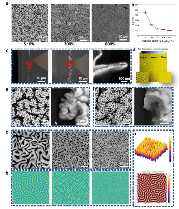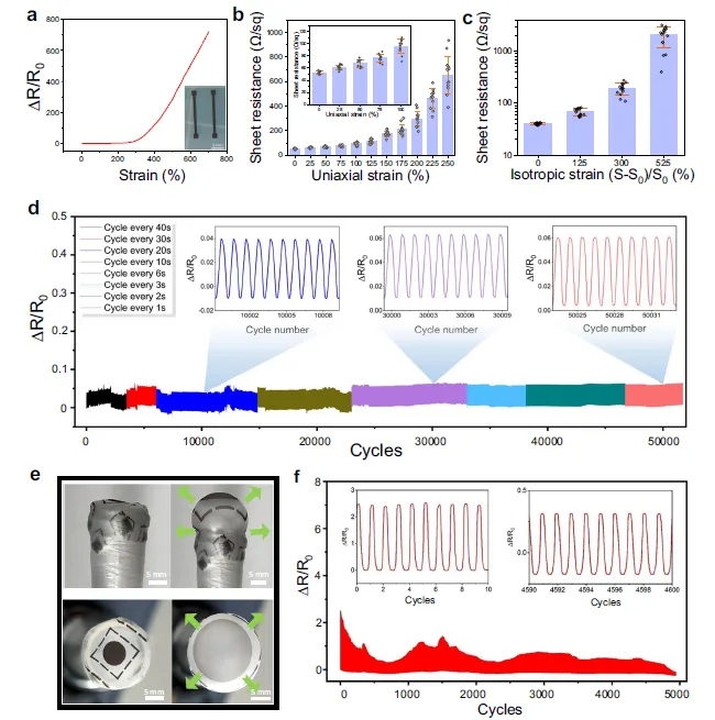 对于其高可拉伸性的形成机制,本研究并未停留在现象描述,而是进行了较深入的结构—性能关联分析。研究发现,当各向同性应变从0%提升至300%再到800%时,表面沟槽结构逐渐被拉平,但在800%以内并未出现明显贯穿裂纹,这意味着导电层可通过沟槽展开来吸收大部分外加变形,而不必立即依赖裂纹释放应力。相比之下,传统微裂纹型金膜在各向同性拉伸时更容易产生贯穿性裂缝,将导电层切割成彼此分离的“岛状结构”,从而迅速失去电连续性。研究还发现,较厚的软基底更有利于自发形成沟槽,而过薄基底会因底部约束削弱聚合物链迁移,难以形成同类表面形貌;与此同时,金膜厚度和蒸镀速率也会影响褶皱尺寸和导电连续性。这种系统化分析使材料设计逻辑更加完整,也说明本研究所提出的方法并非偶然得到某一高性能样品,而是具备一定的机制可解释性与工艺可推广性。