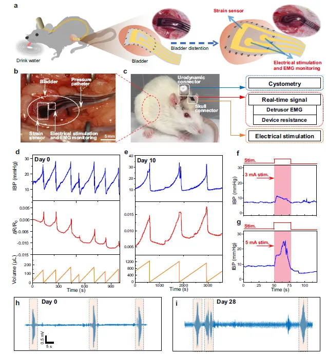 在体内应用层面,研究进一步构建了用于长期植入的完整器件体系。其有效工作区面积约为4.6 mm × 6 mm,包含一个被保护层封装的可拉伸应变传感模块,以及两个裸露区域用于逼尿肌肌电采集和电刺激输出。器件植入膀胱表面后,又通过颅骨连接端口建立了两条信息通路:一条用于电信号采集和刺激输出,另一条用于传统尿动力学压力监测。这样的系统设计非常关键,因为它使研究者能够在同一动物体内同步记录膀胱内压、器件电阻变化和逼尿肌肌电活动,从而直接比较器件信号与真实膀胱生理事件之间的一致性。健康大鼠实验显示,随着膀胱逐渐充盈,贴附于膀胱顶部的器件发生明显且均匀的各向同性形变,过程中未见撕裂、脱落或明显位移,表明其具有良好的顺应性与贴附稳定性。