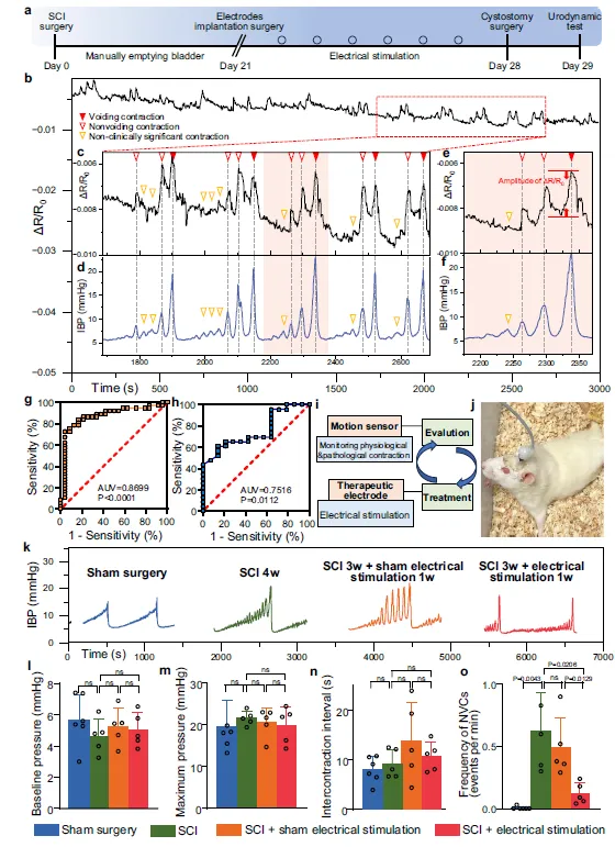 本研究更具临床意义的部分在于,它并未满足于健康膀胱中的信号记录,而是进一步在脊髓损伤诱导的神经源性膀胱模型中评估器件对病理性膀胱活动的识别能力。研究采用经典SCI模型,并在损伤后第21天植入器件,第28天进行膀胱造瘘,第29天开展尿动力学分析。通过同步记录器件电阻与膀胱内压变化,研究将膀胱收缩事件区分为排尿收缩、非排尿收缩以及临床意义不大的轻微收缩三类。结果显示,器件电阻变化峰值与膀胱内压峰值在时间上具有良好一致性,因此研究者进一步将归一化电阻变化幅度作为诊断指标,构建了基于ROC分析的识别模型。结果表明,该指标区分“具有临床意义的收缩事件”和“无临床意义收缩”的AUC达到0.8699,最佳截断值为0.001075,特异度为91.67%,敏感度为72.97%;进一步区分排尿收缩与非排尿收缩时,AUC为0.7516,最佳截断值为0.001290,特异度和敏感度分别为85.71%和56.52%。这说明该器件不仅能作为单纯的形变传感器使用,更具有一定程度上的病理事件识别能力,为后续“检测—判断—触发治疗”闭环策略提供了依据。