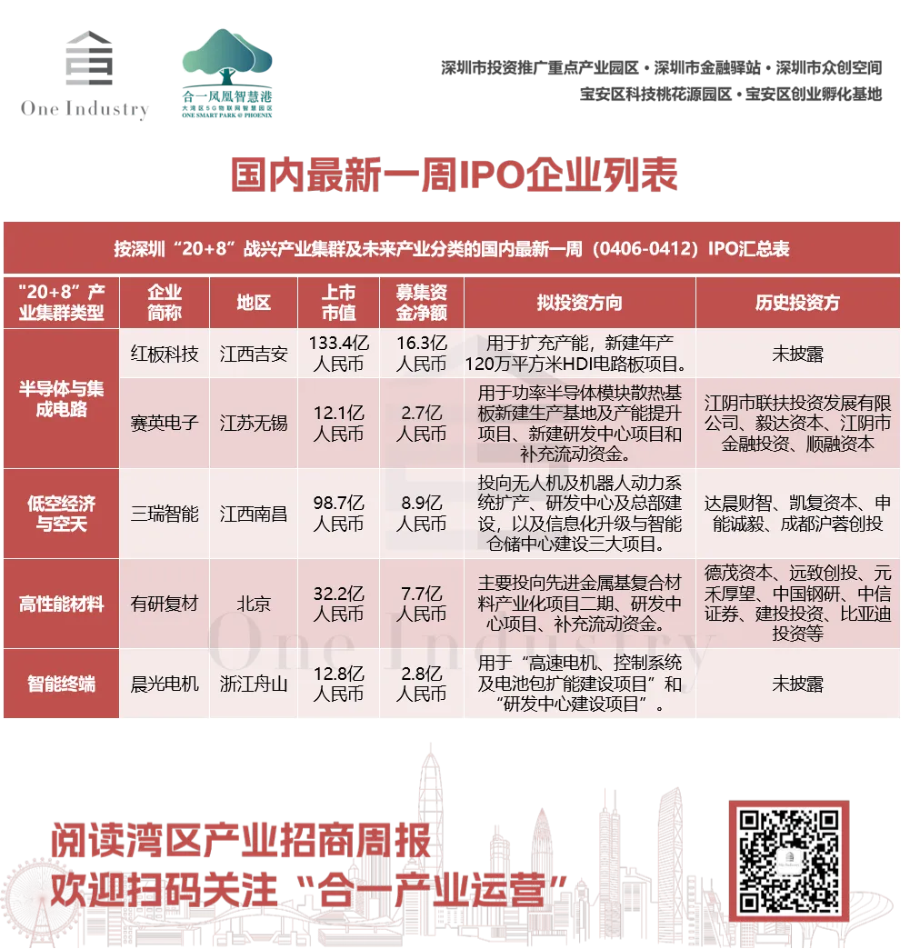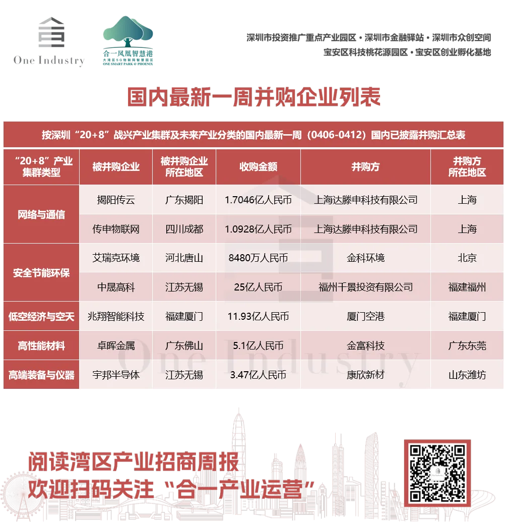 最新一周(0406-0412)国内重点监测到国内5家公司IPO,位于上交所、北交所、深交所;国内披露已完成的并购事件11起,其中按深圳“20+8”战兴产业集群及未来产业分类统计口径,过去一周国内共有5家公司IPO和7起并购事件。
