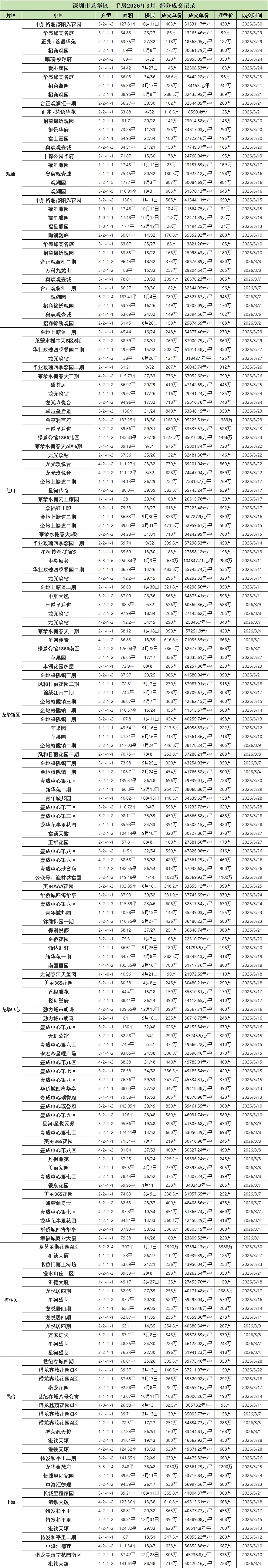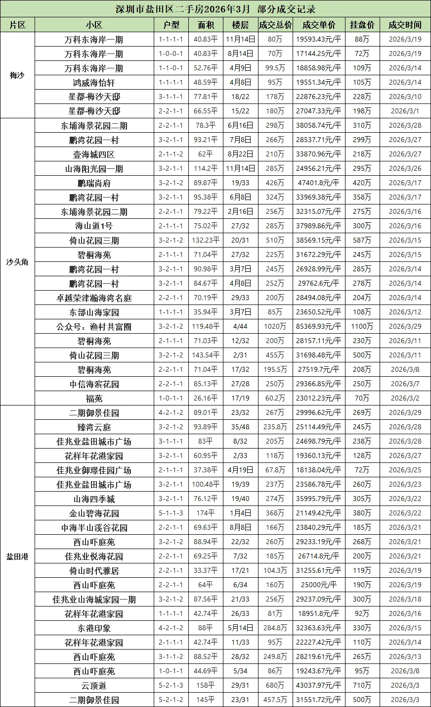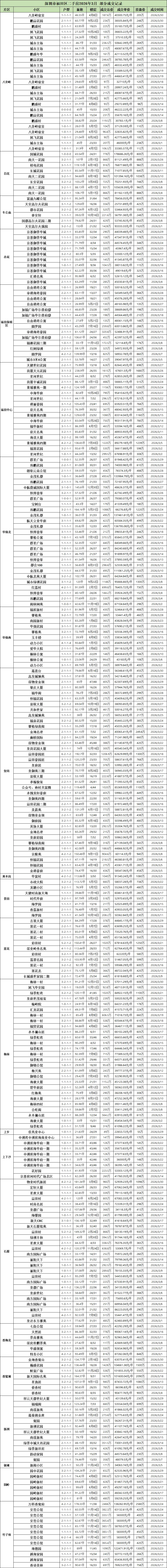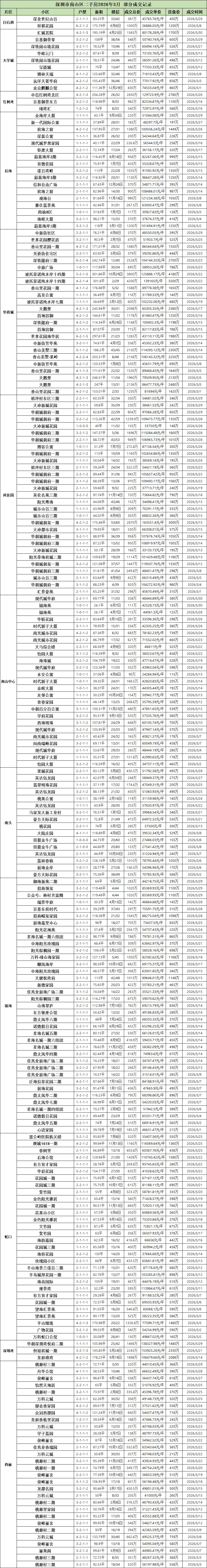 今天就带大家看看,深圳各区2026年3月二手房部分成交记录。(由于格式问题,楼层显示有问题,比如2月10日,就是2楼/10楼的意思)