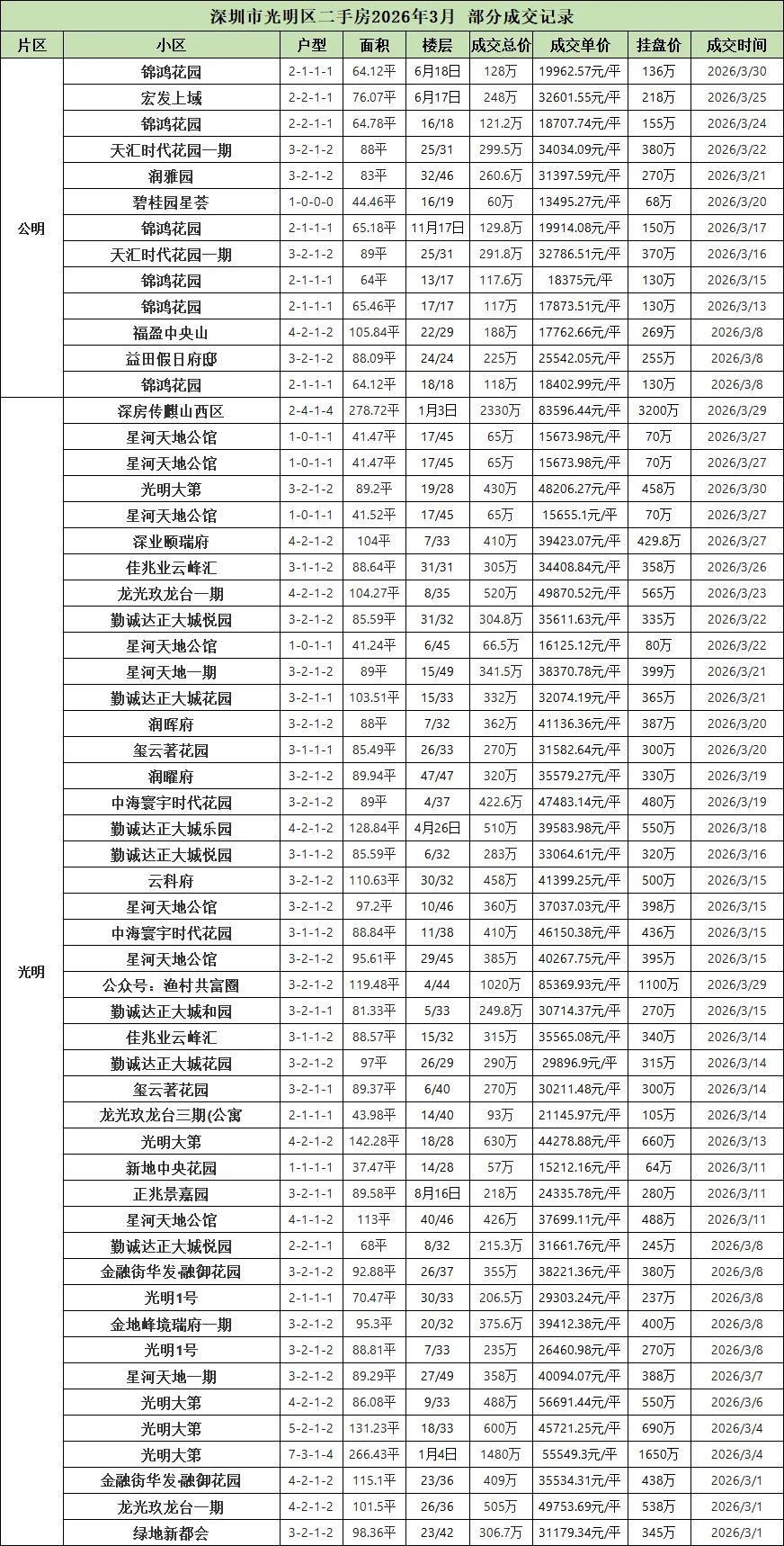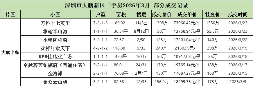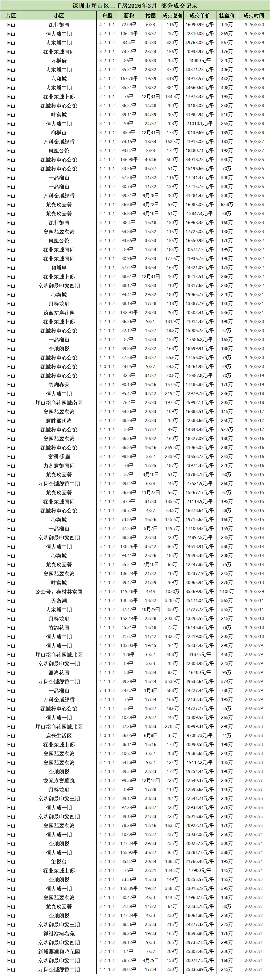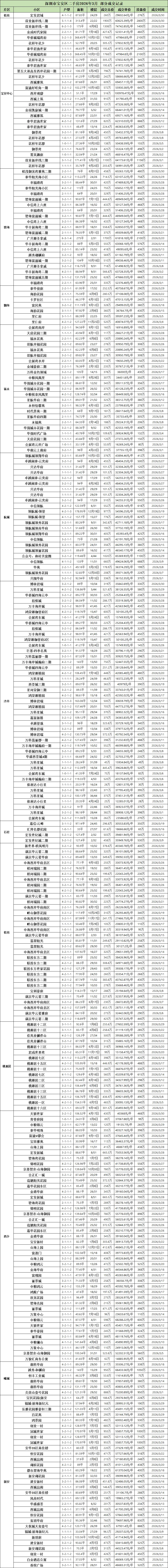 今天就带大家看看,深圳各区2026年3月二手房部分成交记录。(由于格式问题,楼层显示有问题,比如2月10日,就是2楼/10楼的意思)