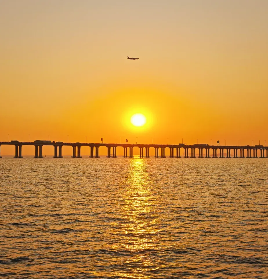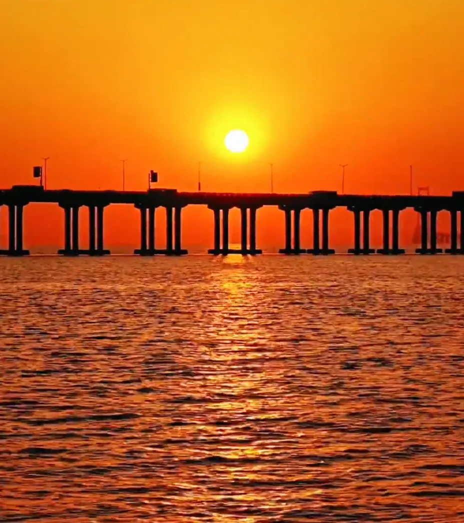 傍晚晚霞铺满天空,海面泛着金色波光,跨海大桥在夕阳里格外温柔。坐在岸边看落日沉入海平面,时间仿佛都慢了下来,没有拥挤的人群,只有海风与落日,适合一个人发呆,也适合和家人闲聊。