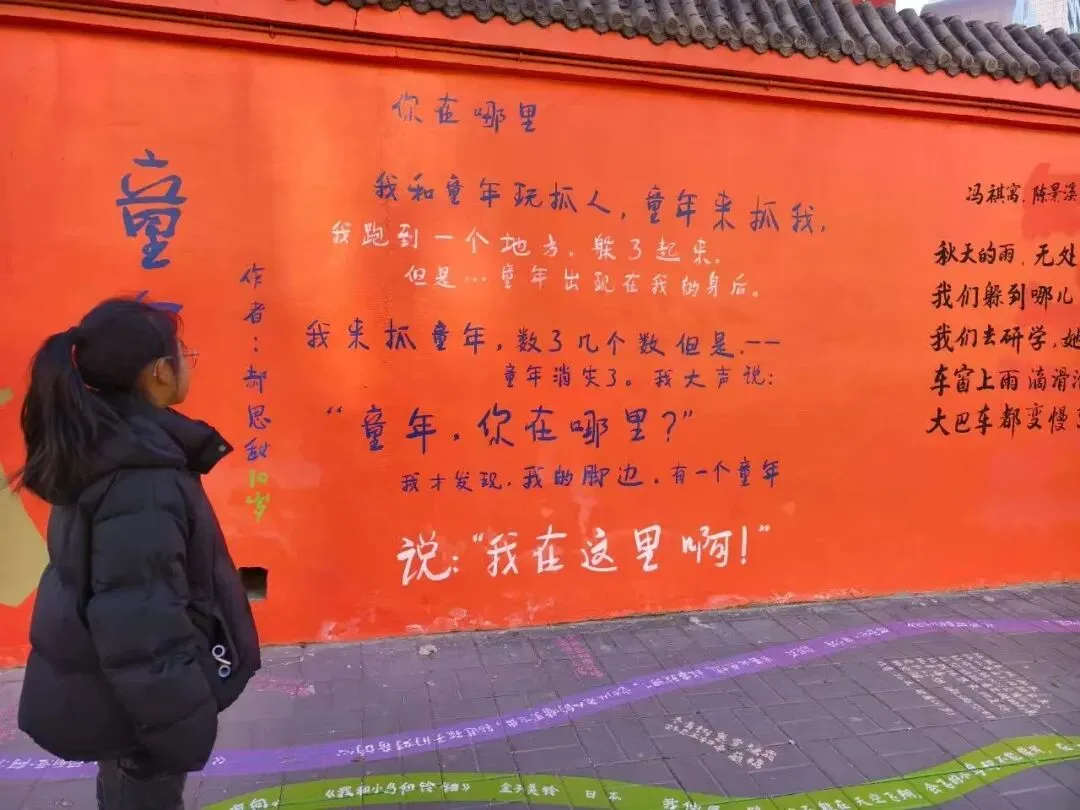 北京十一学校丰台小学校门口长约100多米的阻车墩和墙面上,写满了孩子创作的诗句。这所重视学生读写的小学经过与有关部门协商把一条街变成了一个“诗歌博物馆”。学校发动全校学生写诗,两个月收集了500多首,把整个街道变成了真实的学习场景。