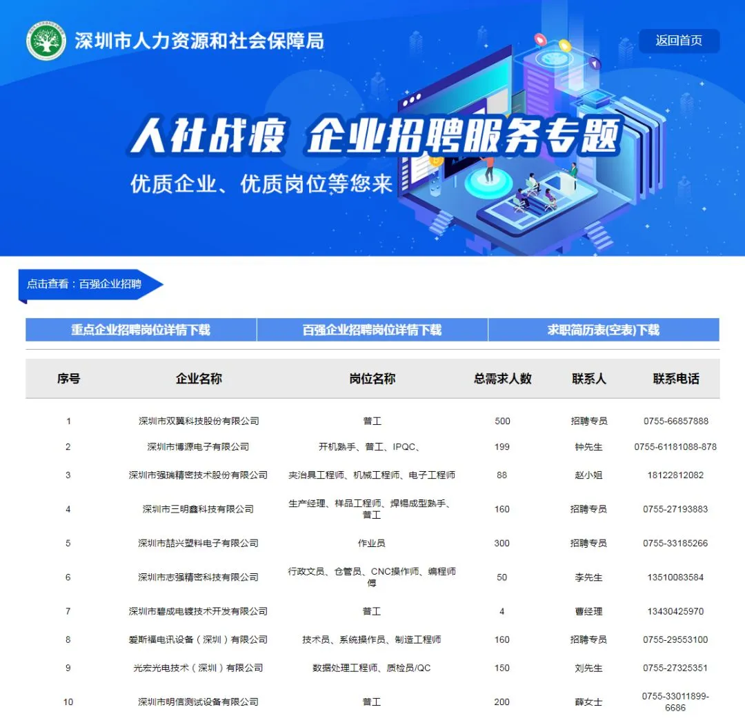 针对因新冠肺炎疫情造成求职者“就业难”的现实问题,为满足务工人员的求职需求,深圳市人力资源和社会保障局开辟了“人社战'疫' 企业招聘服务专题”和“2020年深圳市重点企业网络招聘会”,共有337家企业报名网络聘会,其中有52家是重点产业链企业,共发布近40000个岗位。普工人均薪酬4000-7000元