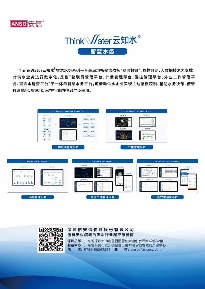 公司总部位于深圳南山创智云城,生产基地位于东莞寮步安信物联网产业中心,配套建设有供水大流量计量中心实验室、漏控实训基地、供水服务大数据中心和全场景供水设施与平台仿真体验中心,是集智慧水务系统、漏控服务和流量仪表等物联设备的研发、生产、销售、服务为一体的国家高新技术企业。