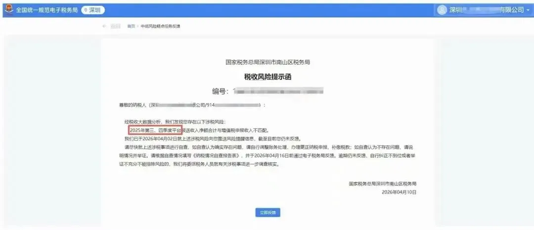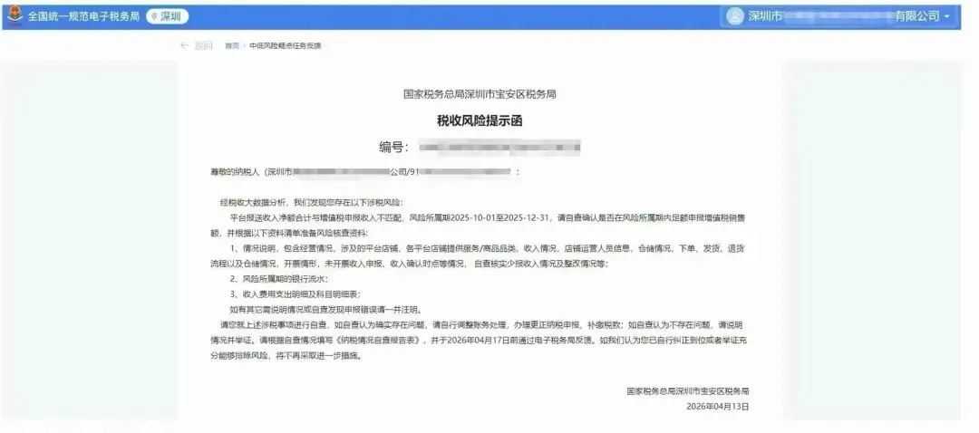1. 南山:2025年3-4季度,平台报送收入净额 ≠ 企业增值税申报收入,数据严重不匹配2. 宝安:2025年10-12月,跨境电商平台流水与企业申报销售额比对异常